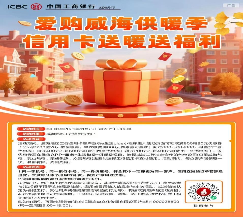 為釋放居民消費(fèi)潛力,工行威海分行聚焦市民“衣食住行”核心需求,構(gòu)建起“供暖繳費(fèi)減負(fù)+家電國(guó)補(bǔ)加碼+場(chǎng)景消費(fèi)煥新”三大優(yōu)惠矩陣,讓金融紅利精準(zhǔn)滴灌威海千家萬(wàn)戶。